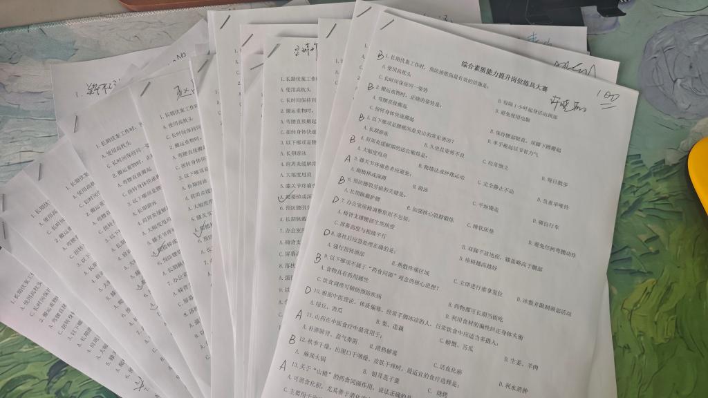 在综合素质能力提升岗位练兵大赛中,全体教职工通过答题的形式,增进了对康复专业技能、药食同源知识、行政能力的掌握,综合质素得到提升。最终根据的答题得分,评选出一等奖2人、二等奖2人,三等奖4人,四等奖4人。