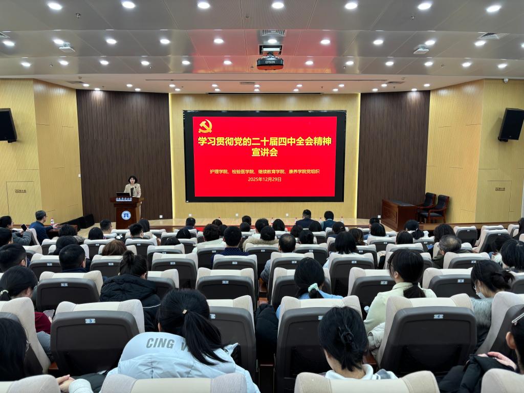 12月29日下午,学校护理学院党总支、检验医学院党总支、继续教育学院党支部、康养学院党支部在基础医学院报告厅联合举办党的二十届四中全会精神宣讲会,邀请学校学习宣传贯彻党的二十届四中全会精神宣讲团成员、马克思主义学院党总支书记刘景伟作宣讲报告,宣讲会由康养学院党支部书记胡莉莉主持。